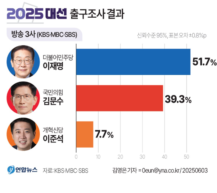 방송 3사(KBS, MBC, SBS) 출구조사에 따르면, 주요 후보의 득표율은 다음과 같았습니다: